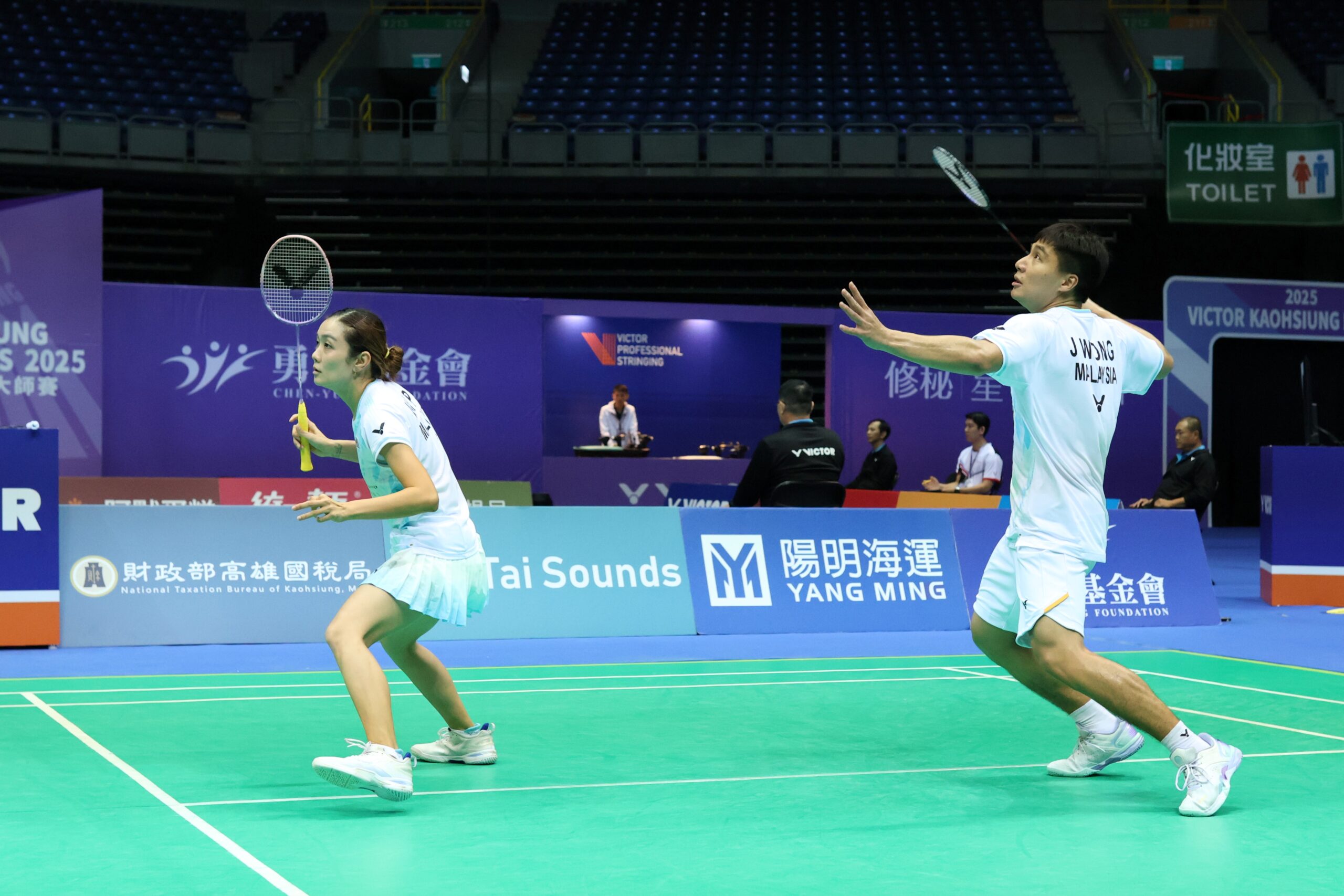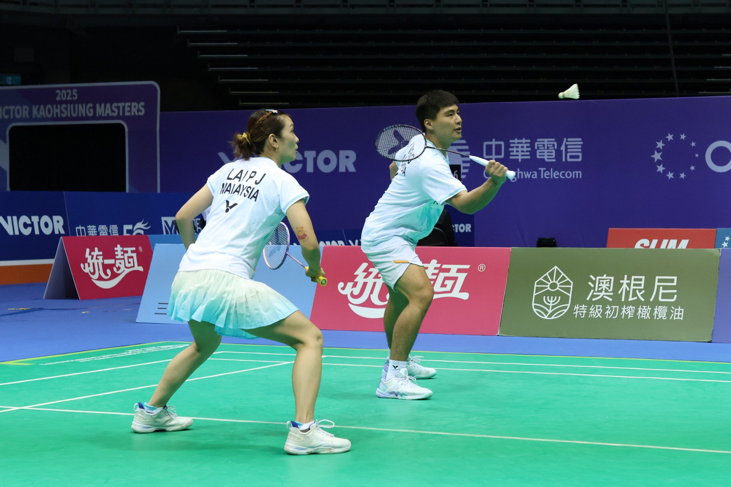 2025高雄羽球大師賽混雙第1種子馬來西亞賴沛君/黃顯維是本屆奪冠大熱門,24日首輪展現驚人實力,以21比8、21比3,直落二擊敗台灣新組合黃睿璿/黃可欣,順利晉級16強,明天將出戰台灣另一組混雙搭檔鄭凱文/劉巧芸。